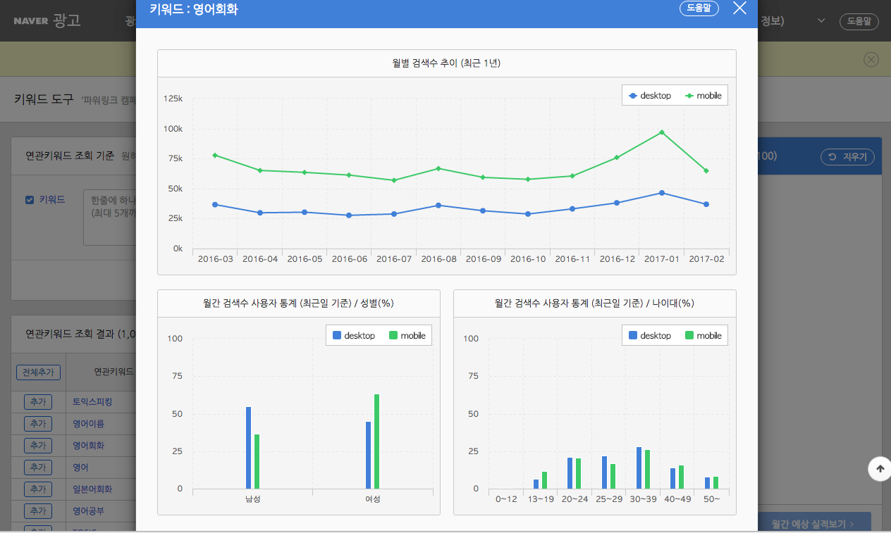 검색광고 사이트를 잘 써먹는 방법은 키워드 확인에만 있지 않다. 개인적으로 진짜 백미는 ‘연간 키워드 추이’를 확인할 수 있는 점이라고 생각한다. 연관 키워드 중 하나를 클릭해보면 최근 1년의 월별 검색 수 추이와 월간 검색 수 사용자에 대한 성별과 나이 분포를 최근일 기준으로 PC와 모바일로 구분해 확인할 수 있다. 이 얼마나 아름다운 통계인가.