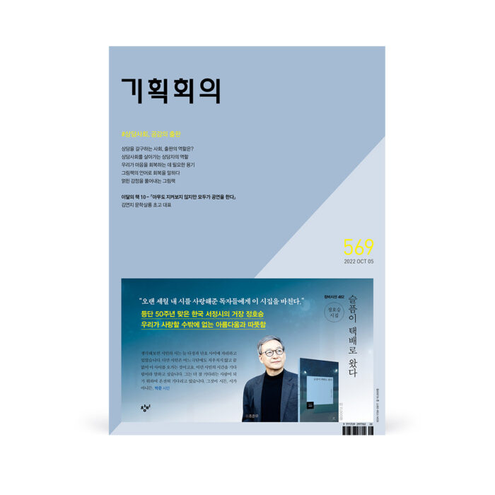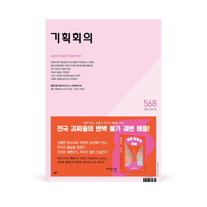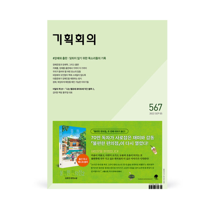 기획회의<기획회의> 567호(2022.09.05) 이슈 “장애와 출판 : 잊히지 않기 위한 목소리들의 기록” 오늘날 장애에 대한 윤리적인 관점은 굉장히 다양하고, 또 매 순간 달라지고 있다. ‘장애’라는 단어가 유튜브 등의 다양한 플랫폼과 각종 콘텐츠 시장에서 거대한 이슈를 만들어 내고 많은 이의 관심을 끌고 있지만, 한편으로 장애를 희화화하고 억누르는 적대적 콘텐츠의 무분별한 생산이 이루어지고 있기도 하다. 그렇다면 이러한 상황 속에서 출판은 장애를 어떻게 말하고 있을까? <기획회의> 567호에서는 사회적·상업적 이슈를 불러일으키고, 또 계속해서 이슈가 되어야만 할 ‘장애’를 다룬 출판의 모습을 살펴본다.₩9,000