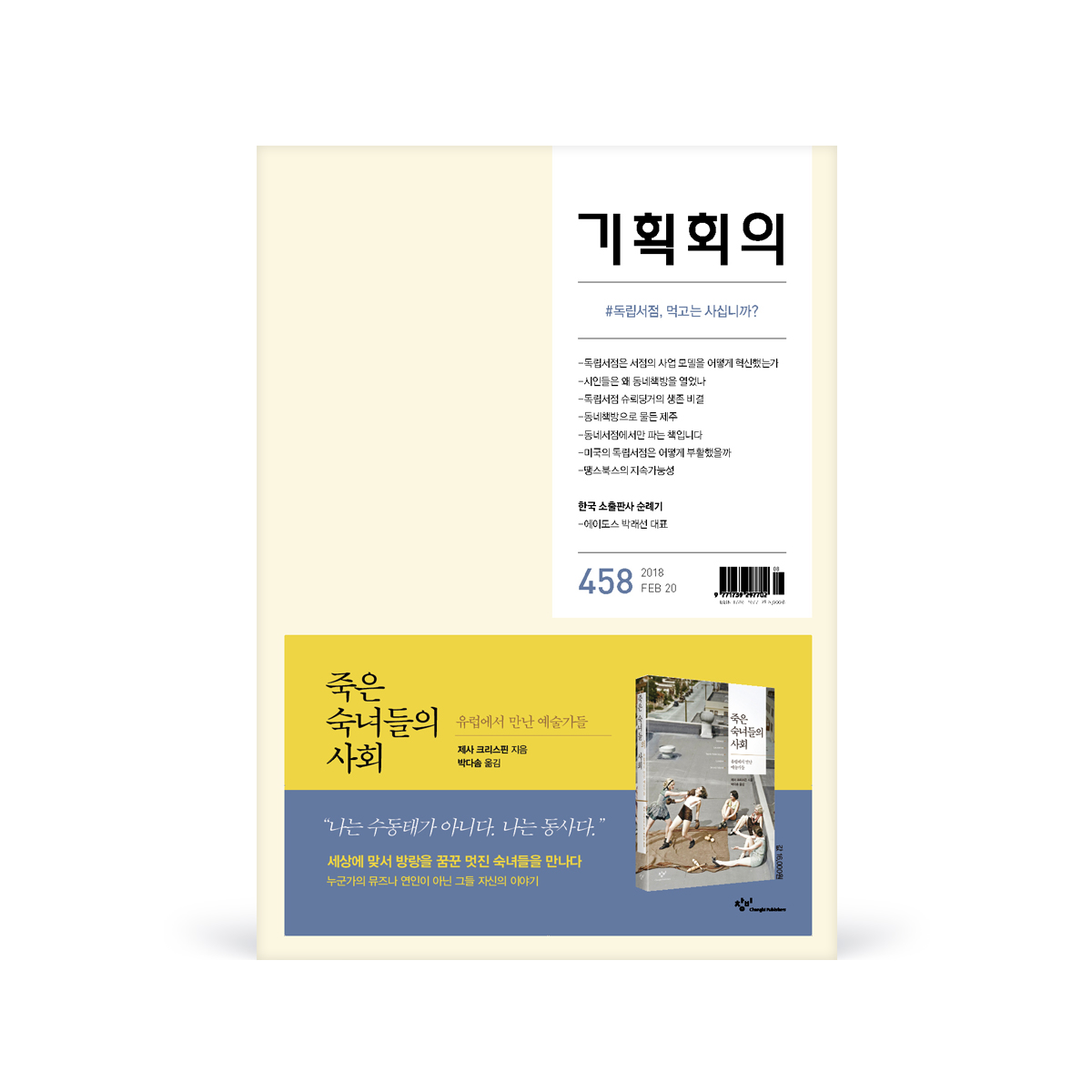 기획회의458호(2018.02.20) 이슈 “독립서점, 먹고는 사십니까?” 단군 이래 최대의 불황이라는 출판산업. 출판산업과 먹이사슬을 같이 하는 서점업의 현실은 더 가혹합니다. 그 와중에 독립서점이라고 불리는 개성 있는 동네서점들의 행보가 예사롭지 않습니다. <서울경제> 11월 1일 자 「수도권 중심 ‘작은 서점’ 증가…“20∼30대 여성이 붐 주도”」에 따르면 2016년 말과 비교해 2017년 상반기만 해도 전국에 중소형서점이 100곳 가까이 늘어났다고 합니다. 한 주에 3개꼴로 새로운 서점이 생겨난 셈이지요. 참고서 위주의 동네 중형서점이 몰락하는 가운데, 젊은이들의 새로운 창업 아이템으로 서점업이 각광받고 있는 것은 놀랄 만합니다. 독립서점 창업 열풍이 불고 3년 이상 안정적으로 운영을 유지해온 독립서점의 사례가 늘고 있는 현재, 독립서점이 지속가능한 비즈니스 모델이 되기 위해서는 어떤 것이 필요할까요. 독립서점 생존의 비결을 들어봅니다.₩7,200