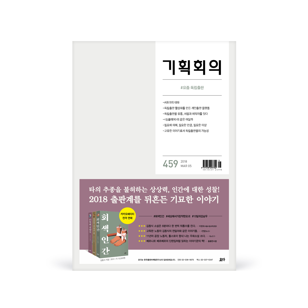 기획회의<기획회의> 459호(2018.03.05) 이슈 “요즘 독립출판” 정형화된 틀에서 벗어나 개성 넘치는 콘텐츠로 독자들의 사랑을 받고 있는 독립출판물. 기술의 발전으로 출판의 장벽이 낮아지면서 누구나 쉽게 책을 출간할 수 있게 된 것도 독립출판시장 활성화의 큰 몫을 차지합니다. 소량 인쇄가 가능한 POD 기술은 물론이고, 출간 전 제작비를 마련할 수 있는 크라우드펀딩, 독립출판물 유통 플랫폼이 따로 생겨나기도 했지요. 또한 이제는 독립출판으로 출간한 책을 기성 출판사에서 재출간하기도 하며 독립출판과 기성출판의 경계가 점점 모호해지고 있다는 것도 특징이랄 수 있겠습니다. 이제 우리는 독립출판물을 어떻게 이해해야 할까요. 반짝 인기라고 치부했던 과거와 달리 독립출판물은 하나의 문화로 확고하게 자리를 잡았습니다. 기성출판의 아류라는 편견에서 벗어나 출판시장의 다양성과 활성화에 긍정적인 영향을 주는 독립출판물. 책이 외면 받는 시대에 독립출판물이 지금까지 많은 독자들의 사랑을 받을 수 있는 이유는 무엇일까요. 이번 <기획회의>는 독립출판 신을 살펴봅니다.₩7,200 -