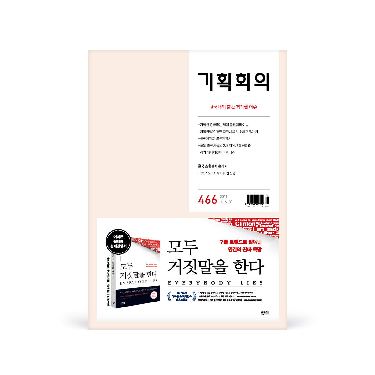 기획회의466호(2018.06.20) 이슈 “국내외 출판 저작권 이슈” 지난 3월 13일 문화체육관광부 서울사무소 앞에서 많은 출판인들이 ‘문화국가 건설을 위한 출판적폐청산 제1차 출판인대회’를 열었습니다. 그곳에서 가장 뜨거운 목소리로 외친 것이 바로 “저작권법 독소조항 62조 2항 개정”이었습니다. 대학 내에서 수업목적으로 이용되는 저작물을 보상하기 위한 ‘수업목적보상금’ 제도에 대한 문제였습니다. 이 같은 독소조항뿐만 아니라 이미 출판 선진국이 도입한 공공대출권, 사적복제보상금 제도 등 출판산업이 발전하기 위해 개선되어야 할 저작권 문제들이 많습니다. 이에 <기획회의>에서는 국내외 출판 저작권 이슈를 살펴보며 문제 해결의 실마리를 찾아보려고 합니다. 또한 ‘트랜스 미디어’를 외치는 시대에 2차 저작권 활용은 어떻게 해야 할지 들어봅니다.₩7,200 -