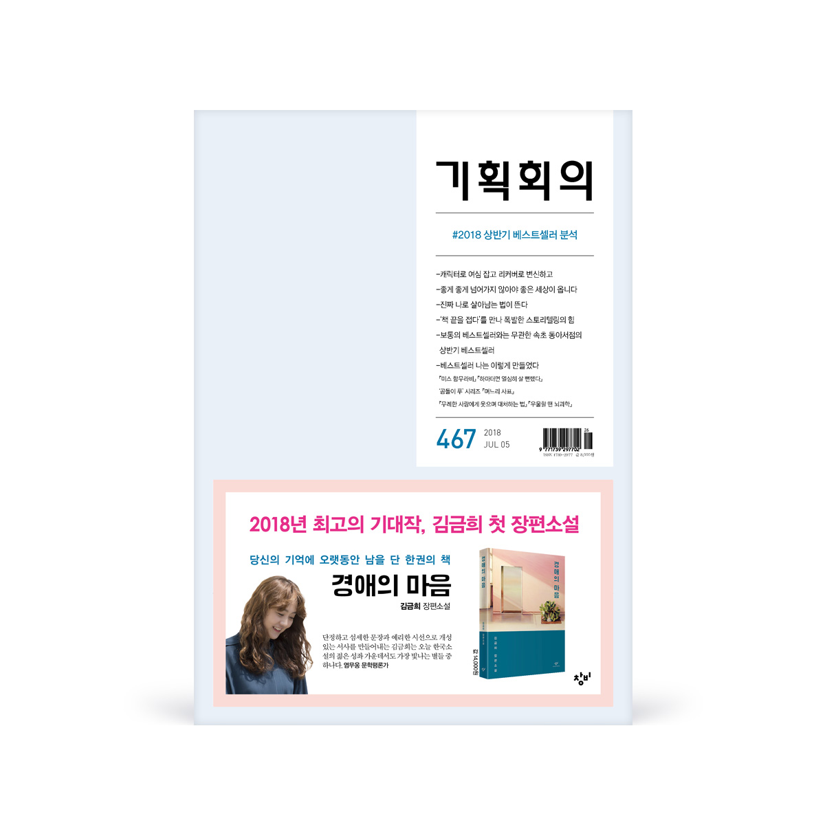 기획회의<기획회의> 467호(2018.7.5) 이슈 “2018 상반기 베스트셀러 분석” 지난 4일 교보문고와 예스24가 ‘2018 상반기 베스트셀러 결산’을 발표했습니다. 두 서점의 상반기 베스트셀러 리스트를 살펴보면 『무례한 사람에게 웃으며 대처하는 법』(가나출판사)이 두 서점의 베스트셀러 1위에 올랐고, 『82년생 김지영』(민음사)은 올해 상반기도 많은 사랑을 받아 베스트셀러 2위에 올랐습니다. 올해 상반기는 유난히 사건사고가 많았습니다. 평창동계올림픽, 남북정상회담뿐만 아니라 ‘미투운동’ 등 굵직한 사회적 이슈들이 있었지만, 책을 읽고 구입하는 독자들은 늘어난 것으로 보입니다. 특히 시, 에세이, 소설 등 문학 분야는 전년 동기와 비교해 10% 이상의 증감율을 보이며 강세를 보였습니다. 상반기 베스트셀러 1위, 2위를 차지한 두 책은 여성 구매 독자 비율이 약 80%를 차지했습니다. 이번 <기획회의>에서는 주요 서점들의 상반기 종합 베스트셀러 순위를 살펴보며, 상반기 출판 트렌드를 분석해봅니다.₩7,200 -
