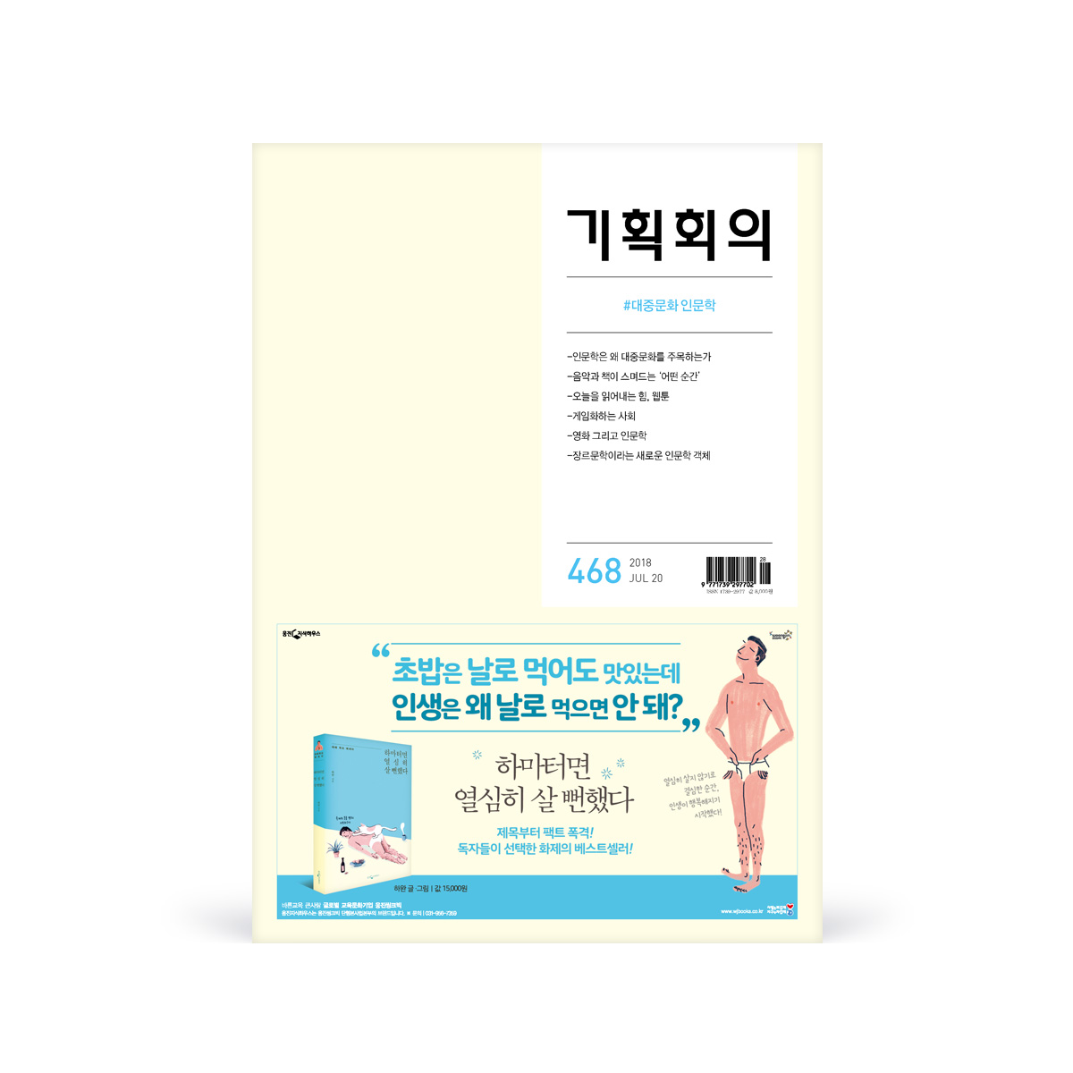 기획회의468호(2018.07.20) 이슈 “대중문화 인문학” 한때 인문학의 대중화가 대세였다면, 요즘의 대세는 대중문화의 인문학화입니다. 대중문화를 단순히 재미와 유희의 수단으로 바라보았던 시각을 뛰어넘어, 대중문화 안에서 동시대 사람들의 욕구를 발견하고 시대의 이데올로기를 탐구하는 방식의 인문학적 작업들이 각광받고 있습니다. 현대사회에서는 대중문화의 파급력이 그 무엇보다 강력해졌으며, 대중문화 자체가 주류 문화가 되었습니다. 이제 대중문화는 더 이상 평가절하하거나 무시할 수 있는 것이 아닙니다. 이에 <기획회의>에서는 대중문화를 통해 낯설고 새로운 사유 방식을 보여주는 인문학적 작업들을 살펴보고, 지금 왜 인문학이 대중문화를 주목하고 있는지 성찰해봅니다.₩7,200 -