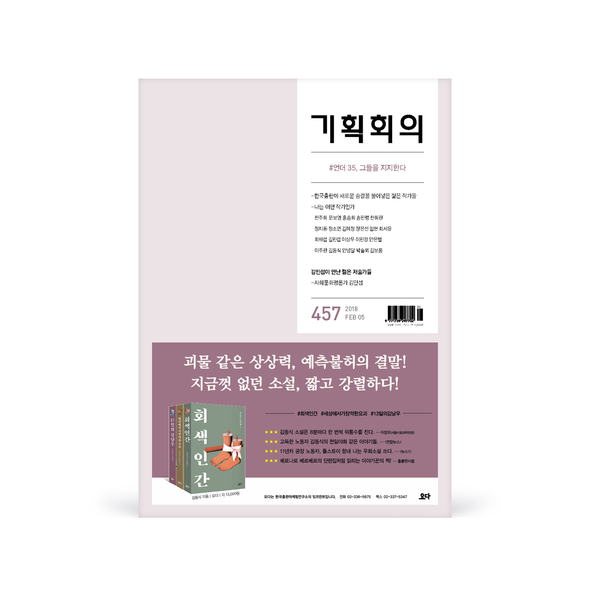 기획회의<기획회의> 457호(2018.2.5) 이슈 “언더 35, 그들을 지지한다” 미래가 더욱 기대되는 젊은 작가들에게 “나는 왜 읽는가?” “나는 왜 쓰는가?” “나를 작가로 이끈 책 3권” 공통질문을 던져 답을 들어보았습니다. 출판의 진입장벽이 낮아지고 다양한 경로로 책을 낼 가능성이 커지면서 예상치 못했던 젊은 작가들이 대거 등장했습니다. 이들은 과연 어떤 작가일까요. 젊은 작가군은 출판의 보루입니다. 이들이 다음 책을 안정적으로 펴낼 수 있도록 출판계는 이들을 마땅히 주목하고 지지해야 할 것입니다. 새해를 맞아 출판계에 신선한 바람을 불어 넣어줄 젊은 작가들의 이야기를 들어봅니다.₩7,200 -