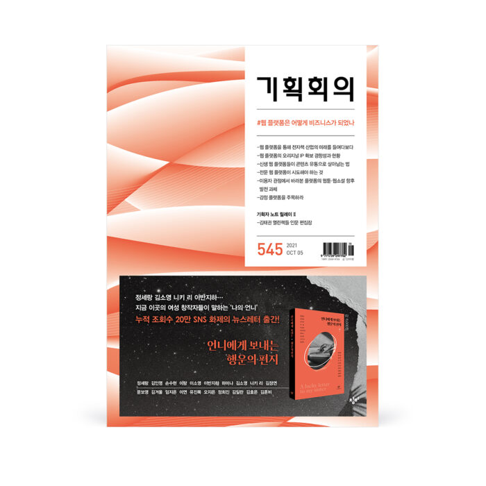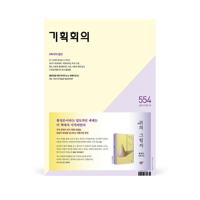 기획회의<기획회의> 554호(2022.02.20) 이슈 “독자의 발견” 메타버스와 NFT에 대한 논의가 활발히 전개되는 지금은 DT 시대, 개인의 영향력이 어느 때보다 높아진 시기이기도 하다. 5년 전부터 ‘독자’에 관해 끊임없이 천착해 온 <기획회의>(2017년 10월 20일자 394호 <기획회의> “독자, 당신은 누구시길래”)는 이러한 DT 시대를 맞아 이 시기의 ‘독자’를 다시 한 번 탐구한다. 이번 554호 “독자의 발견”에서는 디지털 기술이 나날이 발전하는 가운데 읽는 사람은 어떻게 변화해왔고 앞으로 어떻게 변화할지, 책을 소비하고 구매하는 방법에는 어떠한 변화들이 있을지 살펴본다.₩9,000 -
