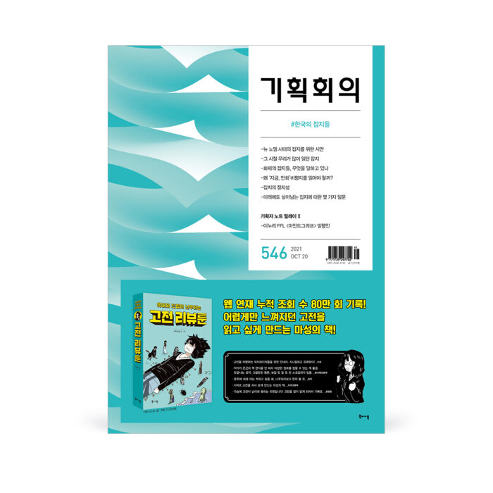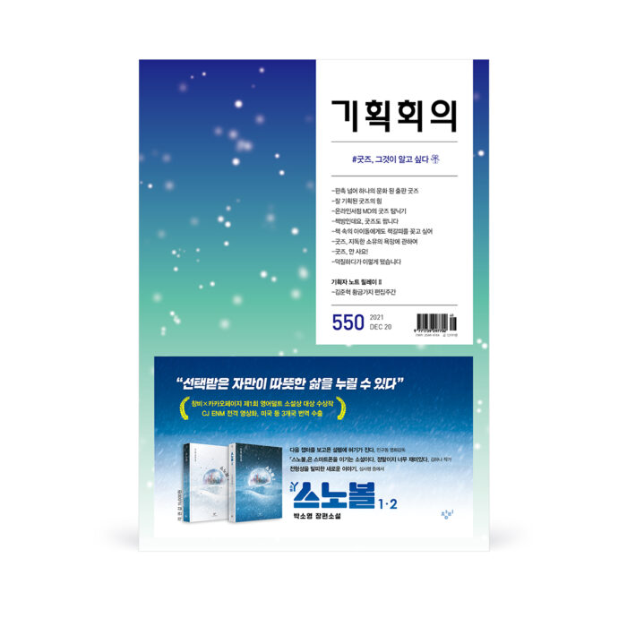 기획회의<기획회의> 552호(2022.01.20) 이슈 “2022 북디자인 트렌드” 북디자인은 단순히 ‘책의 얼굴’이 아니다. 북디자인은 출판사가 독자들과 소통하는 방식까지 바꿀 수 있다. 책의 표지만이 아니라 내지 구석구석에 숨어 있는 코드를 찾는 것도 책을 읽는 재미를 배가시켜 준다. <기획회의> 552호에서는 국내 북디자인 경향과 변천사를 살펴보았다. 국내외 북디자이너의 업(業) 이야기, 최근의 북디자인 마케팅 트렌드인 리커버, 장르문학의 북디자인 변천사 등을 짚어보며 오늘날 북디자인의 가치를 논해본다.₩9,000 -
