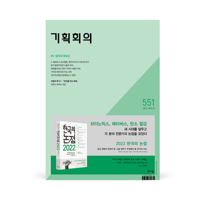 기획회의<기획회의> 551호(2022.01.05) 이슈 “K-컬처와 북로드” 작년 연말, 넷플릭스 오리지널 시리즈로 제작되어 큰 인기를 끈 <지옥>의 원작 도서 판권이 미국, 일본 등 11개국에 수출되었다. 연상호와 최규석의 합작만화 『지옥』을 출간한 문학동네를 포함하여, 최근 전 세계적으로 콘텐츠 경쟁력을 발판삼아 성장하는 국내 출판사들의 도서 수출 약진이 돋보인다. 2022년 새해를 맞이하여 <기획회의> 551호에서는 이채로운 매력으로 세계인들의 시선을 흡수 중인 K-콘텐츠 대세에 힘입어 동시대에 주목받는 한국 도서들을 살펴보고, 향후 국내 출판시장의 해외 판로를 조망하고자 한다.₩9,000 -
