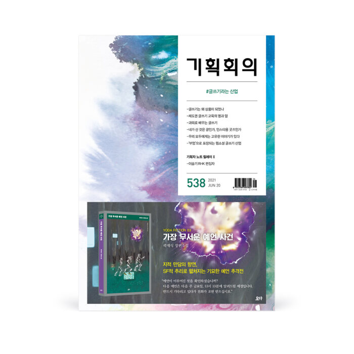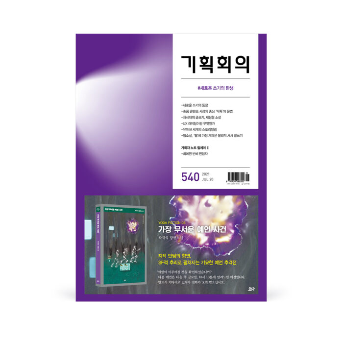 기획회의<기획회의> 540호(2021.07.20) 이슈 “새로운 쓰기의 탄생” 메시지가 읽히고 콘텐츠가 소비되는 환경에 따라 글을 다루는 방식이 달라진다. 지난 <기획회의> 539호에서는 에세이, 소설, 드라마, 영화, 희곡, 라디오 등 현업에서 글쓰기 경험을 쌓아 온 이들과 함께 고전적 매체별 글쓰기의 특징을 살펴보았다. 이번 <기획회의> 540호에서는 숏폼 콘텐츠 시장의 중심인 ‘틱톡’의 문법, 차세대 글쓰기로 주목받는 채팅형 소설 쓰기, UX 라이팅, 유튜브 세계의 스토리텔링, 웹소설 등 다양한 매체의 새로운 ‘쓰기’를 살펴보고 콘텐츠 시장의 지각변동을 돌아본다.₩9,000 -