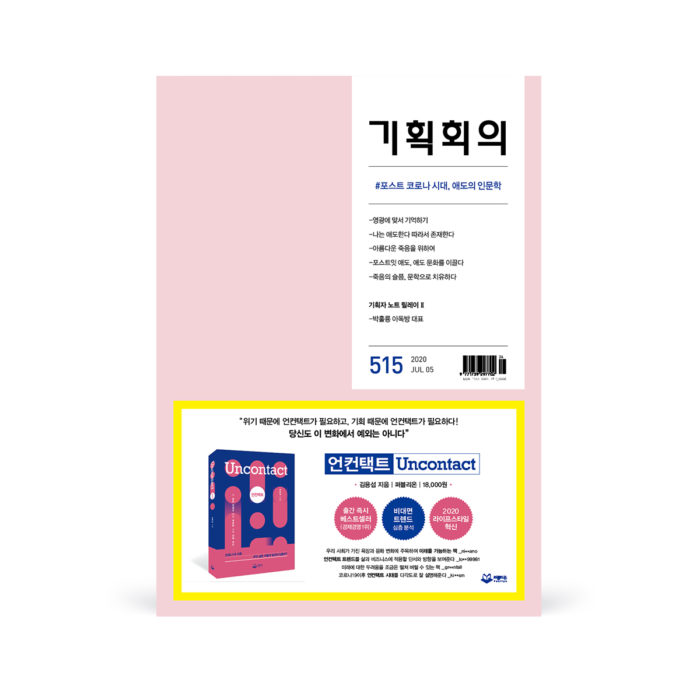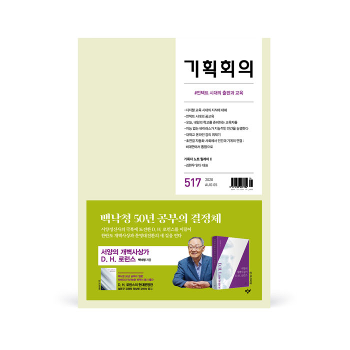 기획회의<기획회의> 517호(2020.08.05) 이슈 “언택트 시대의 출판과 교육” 코로나19의 여파로 국내 초중고와 대학교, 교육현장은 발 빠르게 웹과 모바일에서 비대면 수업 및 강의를 진행 중입니다. 그동안 오프라인에서 활발히 진행되던 독서 모임과 취미 활동을 연계로 한 다양한 커뮤니티 역시 온라인으로 활동 거처를 옮기고 있습니다. 업무 환경에서도 유튜브, 카카오톡 시스코의 웹엑스Webex, 구글의 지스위트G-Suite, 줌Zoom 등을 활용하여 커뮤니케이션의 공백을 최소화하는 중입니다. 언택트 시대를 맞이하여 필수적 변화에 돌입한 대한민국, 이번 <기획회의> 517호에서는 새로운 환경에 접어든 국내 출판과 교육시장을 면밀히 살펴보고자 합니다.₩7,200 -