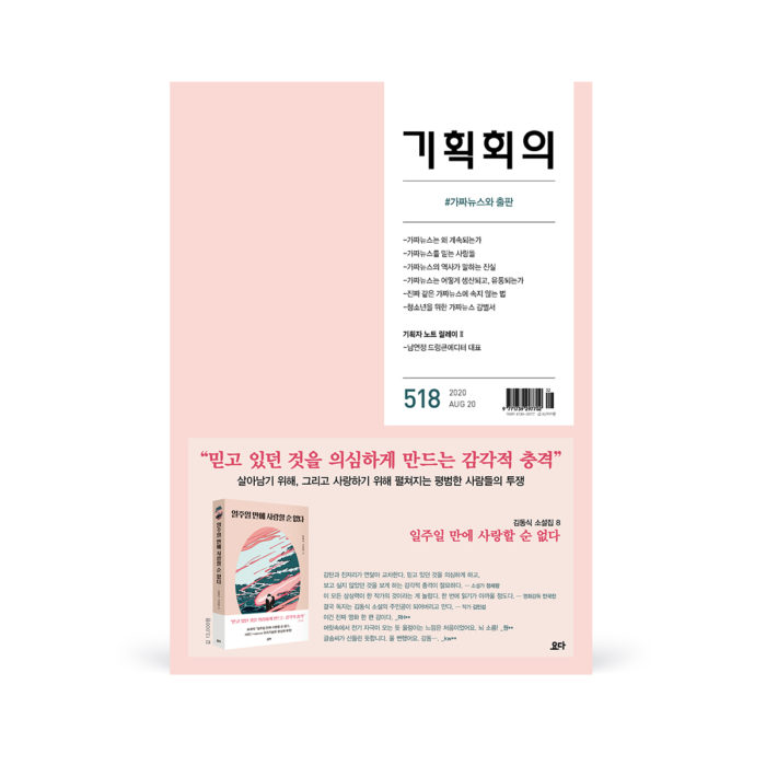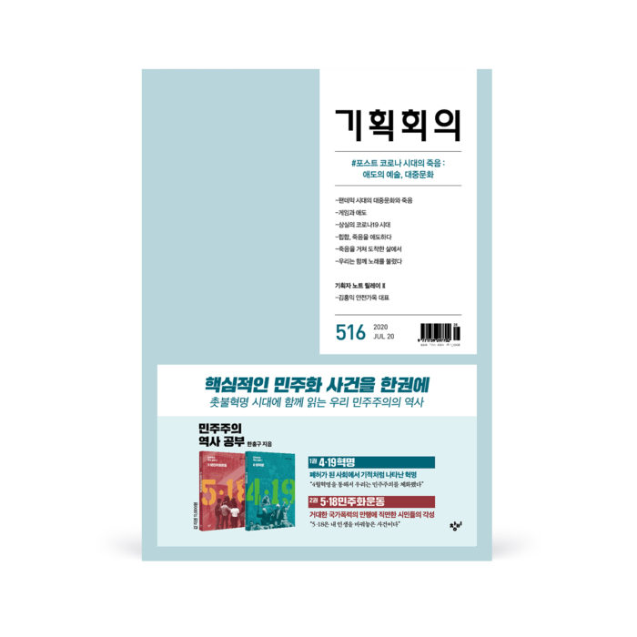 기획회의<기획회의> 516호(2020.07.20) 이슈 “포스트 코로나 시대의 죽음 : 애도의 예술, 대중문화” 참사, 전염병, 테러, 범죄로 인한 죽음을 들여다봅시다. 모든 죽음은 슬프고 허망하지만 참사, 전염병, 테러, 범죄 등의 사고로 인한 죽음은 준비되지 않은 상태로 맞이하게 되기 때문에 더욱 갑작스럽고 억울하게 느껴집니다. 사고로 인한 죽음을 맞이할 때 우리는 가해자(또는 조직)를 처벌하거나 재발 방지를 위해 새로운 법안을 입법하거나 의식 변화를 위한 사회 운동을 조직합니다. 이런 구조적인 행동에 앞서, 선제적으로 이뤄져야 할 것은 ‘애도’입니다. 죽음을 반성하고 위로하는 것은 고인뿐만 아니라 나와 우리를 위한 일이기도 합니다. 이에 ‘애도의 인문학’을 다룬 515호에 이어 516호에서는 ‘애도의 예술, 대중문화’에 대해 이야기합니다.₩7,200 -